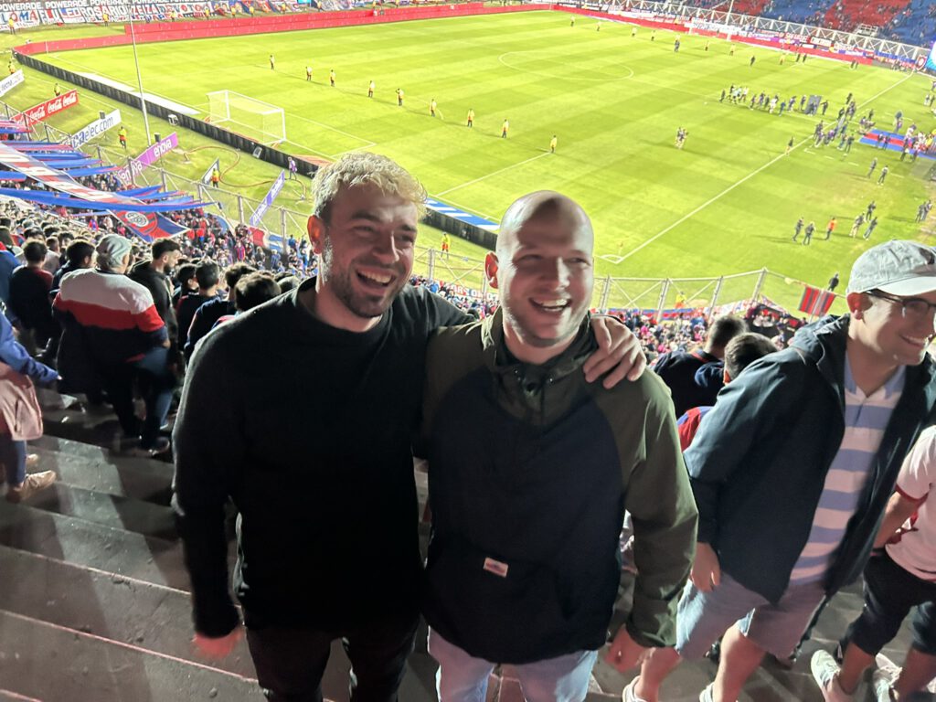 We, inderdaad. Want ik ben deze weken niet alleen geweest. Mijn goede vriend Max had de moeite genomen om over te vliegen naar Buenos Aires. En ondanks dat de meeste lezers Max waarschijnlijk wel kennen, verdient hij net als Patrick een waardige introductie. Ik ken Max als een enthousiaste, goedlachse jongen met het hart op de goede plek. Vaak heel erg druk met z’n werk als fysiotherapeut, maar iemand die altijd tijd voor je maakt. En zo ook nu weer. Iemand die niet alleen zegt dat hij je komt opzoeken toen ik hem vertelde over m’n reis, maar iemand die het ook écht doet. Eerder dit jaar was hij al alleen naar Japan geweest, en dit werd z’n eerste keer in Zuid-Amerika. Toch wat spannender, maar gelukkig met inmiddels een ervaringsdeskundige in ondergetekende aan z’n zijde. Max & ik delen meerdere interesses in het leven, en de 2 grootste daarvan zijn voetbal & humor. Laat die dingen nou net de hele tijd teruggekomen zijn in deze weken… 😊