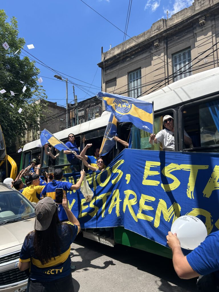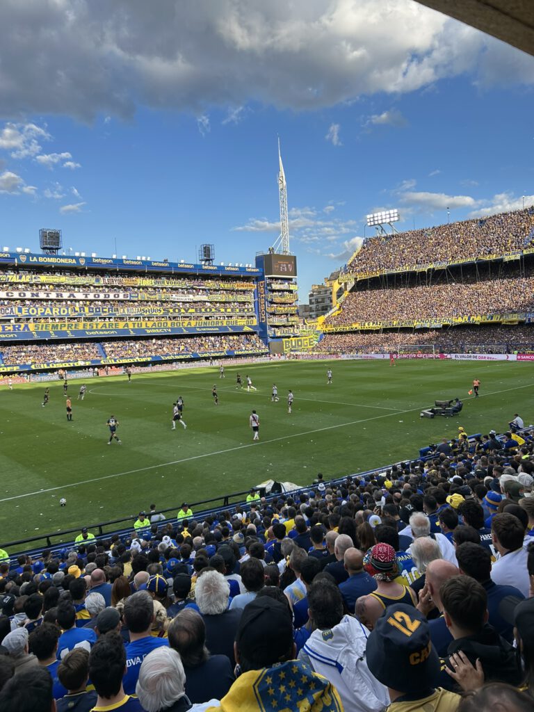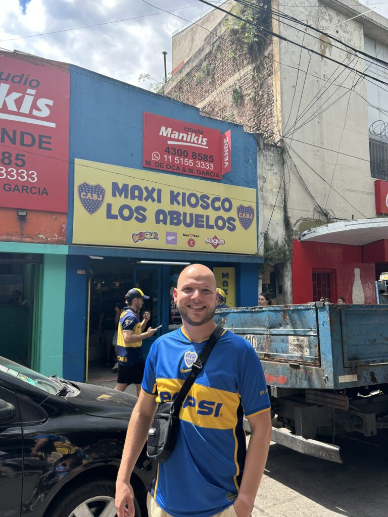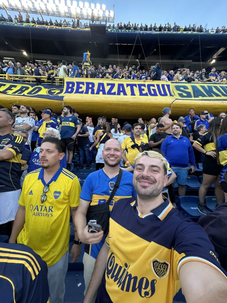 Gekleed in onze retro Boca shirts, vertrokken we vroeg naar de wijk La Boca waar de wedstrijd gespeeld ging worden. Het was misschien 4-5 uur voor de wedstrijd maar de straten liepen al vol. Vuurwerk, getrommel, gezang, het was niet normaal. En we moeten eerlijk zijn, in het begin is het toch even aftasten: hoe gaat de sfeer zijn? Is het veilig? Iedereen aan de fernet cola (de baco van de lage landen) in de ochtend, dus af en toe toch maar even opletten op gekkigheid. Maar het was zeker veilig. We verkenden de straten, maar hadden nog een belangrijke taak: onze tickets ophalen. En dat is toch een spannend moment. We moesten contact betalen, en dat loopt toch net wat minder lekker rond kan ik je vertellen haha! Maar eind goed al goed, we kregen onze kaarten en de man vertelde ons nog dat we geluk hadden want we hadden goede plaatsen. Kaartjes binnen, en nu konden we dus écht genieten. Opgaan in het feestgedrang: springen, dansen, zingen, we gedroegen ons als locals. En toen maar naar binnen. Het kaartje werkte en we waren er dus écht bij. We konden het niet laten om elkaar een goede knuffel te geven. We hadden staanplekken gekregen aan de lange zijde en stonden dicht bij het veld. En wat schrijf je dan over de wedstrijd? Ik bedoel, de opkomst alléén al was genoeg reden om hiernaartoe te gaan. Zoiets heb ik nog nooit gezien. Maar dan, de wedstrijd begon. 0-0 en we hadden elkaar al aangetikt. Zou toch wel een beetje jammer zijn als ze niet scoren. Boca speelde namelijk “onze” kant op. Blessuretijd 1e helft. En je raadt het al. Want het moest zo zijn. Exequiel Zeballos schoot vanaf de 16, keeper hield de bal in 1e instantie nog tegen, maar Zeballos liep door en tikte de rebound binnen: 1-0! En het stadion ontplofte. Ik ben in mijn leven nog nooit door zoveel mensen in 30 seconde geknuffeld en gekust. Ik kan niet eens omschrijven wat er door ons heenging, wat een totale chaos. Deze mensen leven écht voor het voetbal. De wedstrijd eindigde uiteindelijk in een 2-0 overwinning en dat is natuurlijk hét ideale scenario als je naar zo’n pot gaat. De mensen waren blij, wij waren blij en dat ging na de wedstrijd nog uren door buiten het stadion. Wat kan een mens gelukkig worden van voetbal.